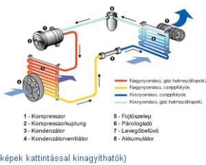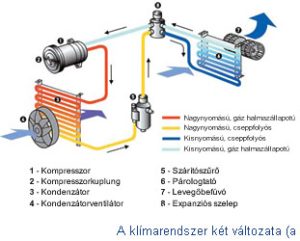 Az autóklíma kompresszora összesűríti a gáz halmazállapotú hűtőközeget, megnövelve ezzel a hőmérsékletét. Ez a kondenzátorba kerül, ahol a menetszél vagy a ventilátor segítségével hőt vonunk el, melynek hatására cseppfolyóssá válik (lecsapódik). A hűtőközeg ezután áthalad a szárítószűrőn, mely párátlanítja, és kiszűri az esetleges szilárd szennyeződéseket. A nagy nyomású, cseppfolyós halmazállapotú hűtőközeg az expanziós szelephez érkezik, amely közvetlenül a párologtató előtt helyezkedik el.